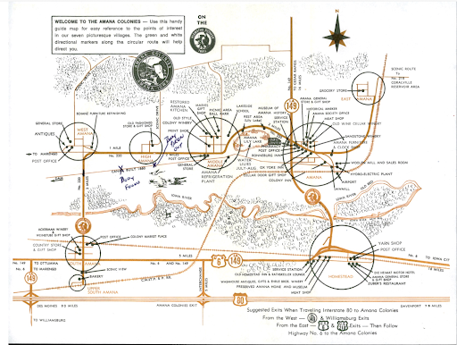 A photo of a map of the Amana Colonies. It contains a handwritten note showing where Karen was found. Courtesy of Iowa County Sheriff’s Office