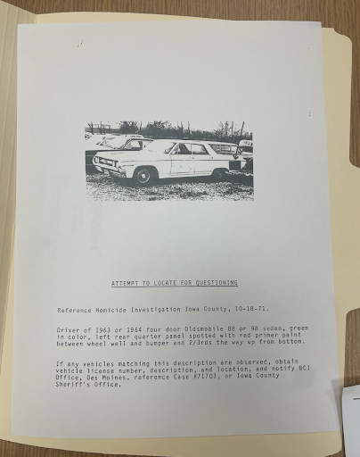 A photo of a page in the police file – an appeal to the driver of the car Karen may have gotten into the night she was murdered. Courtesy of Iowa County Sheriff’s Office.