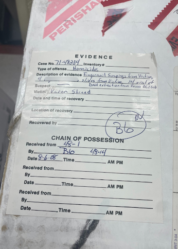 A photo showing the evidence box in Karen’s case. Photo by Audiochuck staff.
