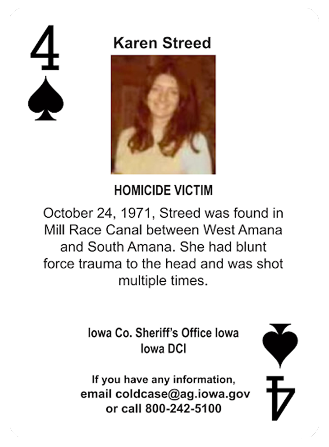 If you or anyone you know has any information on the murder of Karen Streed, you can call Chief Deputy Todd Sauerbrei at the Iowa County Sheriff’s Office at 319-642-7307.
