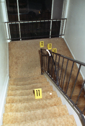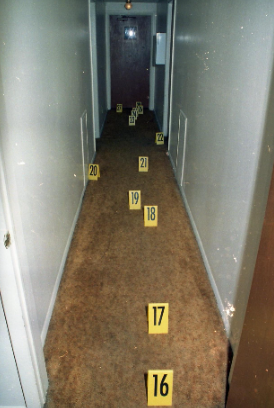 Yellow evidence markers show where investigators found drops of blood in the hall outside Kenny Floyd’s apartment after his murder in 1995. Investigators have developed a DNA profile from that blood evidence that they hope will help them ID Kenny’s killer. Photo courtesy of Aurora Police Department Cold Case Detective Jason McDonald.