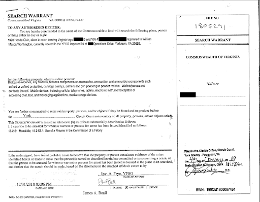 A search warrant was filed in York County Circuit Court after Mason Worthington was shot in his home in December 2018. Courtesy: York-Poquoson Sheriff’s Office.