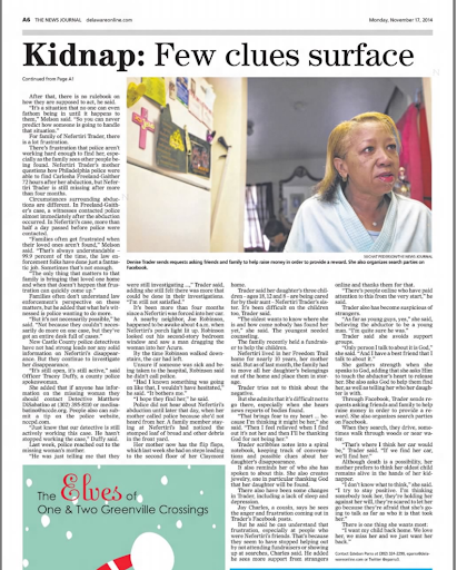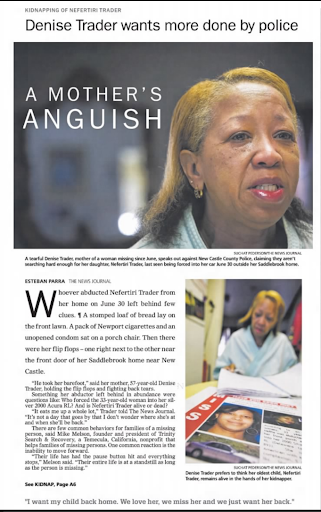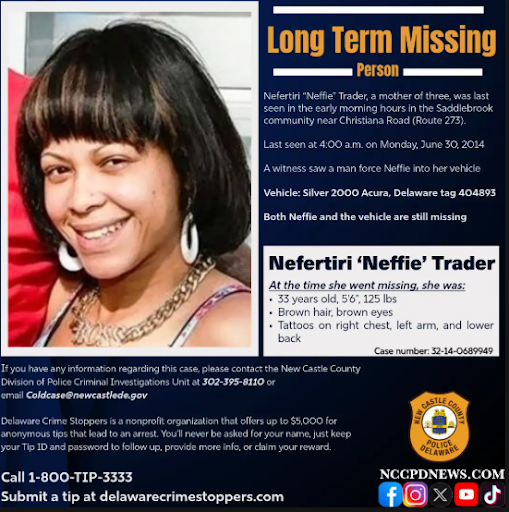 - Chambers, M/Cpl Richard. “LONG-TERM MISSING PERSON – COLD CASE REVIEW: NEFERTIRI TRADER (2014).” New Castle County Police Department News