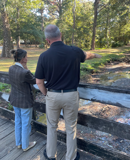 A photo of Detective Michael Wilson speaking with our reporter, Annie Roderique-Jones, close to where Bonnie’s body was found. Photo taken by Audiochuck staff.