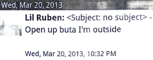 A text Ruben sent a friend at 10:32 p.m. on March 20, 2013. The friend lived less than a mile from Pocasset Cemetery; Courtesy of Cranston Police Department