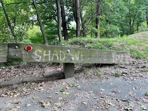 A tribute to Shad, written on a wooden guardrail leading to Pocasset Cemetery; Photo taken by Audiochuck staff