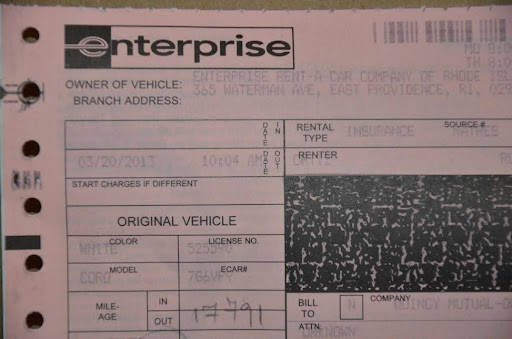 The rental slip for the 2012 Toyota Corolla, showing Ruben rented it on the morning of March 20, 2013; Courtesy of Cranston Police Department