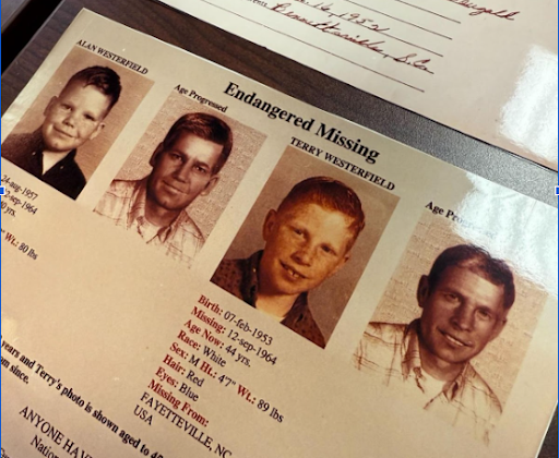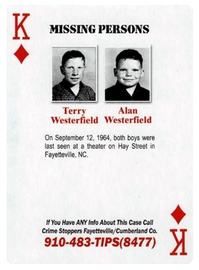 If you have any information about the disappearance of Terry and Alan Westerfield in September of 1964, please get in touch with Lieutenant Jeff Locklear directly at 910-433-1960, or, if you would like to remain anonymous, call the Fayetteville/Cumberland County Crime Stoppers at 910- 483-TIPS.